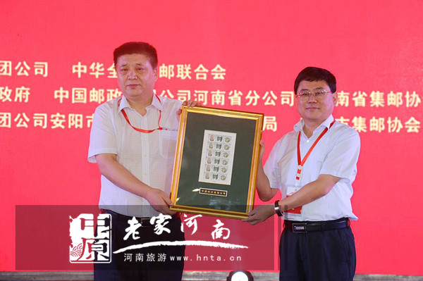 中華全國集郵聯(lián)合會會長楊利民、安陽市人大副主任史東林、安陽市政協(xié)副主席韓力農(nóng)向“我為《殷墟》郵票代言”代表贈送紀念品