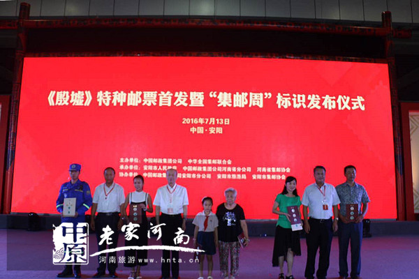 儀式上,中國郵政集團公司向安陽市人民政府贈送第一版《殷墟》特種郵票(版號:01A);中華全國集郵聯(lián)合會會長楊利民、安陽市人大副主任史東林、安陽市政協(xié)副主席韓力農(nóng)向“我為《殷墟》郵票代言”評選出的代表贈送紀念品。