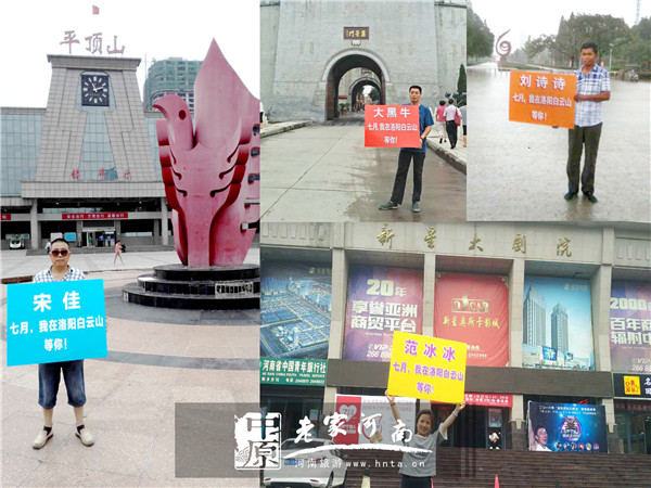 近日,河南連降暴雨,卻出現(xiàn)一批神秘舉牌人,高舉書寫明星名字的牌子在河南十八地市標志性建筑拍照合影,例如在開封大梁門前高舉“范冰冰,七月我在白云山等你”字樣的牌子。詢問得知,原來在7月21日,Rebecca2017趨勢發(fā)布將在“中原山水,斯為最盛”的洛陽白云山森林氧吧華麗上演。屆時李宇春、張雨綺、劉詩詩、吉克雋逸、郭曉婷等國內(nèi)一線明星匯聚于此。為了讓自己喜愛的明星感受到我河南人民的熱情,粉絲們決定在河南十八地市全城聯(lián)動共同舉牌為偶像搖旗助威。讓我們跟著粉絲們的牌子,找找哪個是你所在的城市,你又是哪個明星的粉絲。