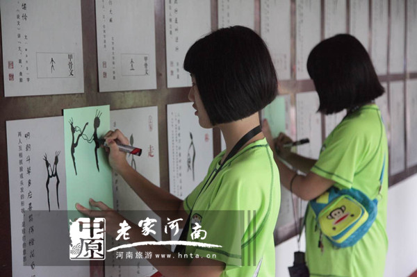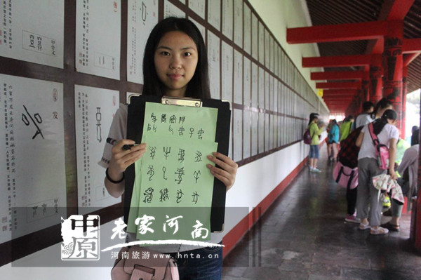 安陽師范學院老師苗利娟對學子們講述我們?nèi)昴莻輝煌的商朝,如何屹立東方位列四大文明古國。來自深圳的劉宇航同學找到了自己姓氏的甲骨文,了解到了中華姓氏文化,在此深刻體會到了中華民族的“同根同源”。而來自臺灣的劉承娟同學第一次來到安陽,在殷墟地下博物館藏品中感到了熟悉和親切,殷墟的講解員向其講述了殷墟發(fā)掘和藏品流傳香港、臺灣的故事。“安陽是一座歷史悠久、文化燦爛的城市,是中國八大古都之一,文化底蘊厚重,作為一名學生,我會將自己看到的、學習到的,向身邊的人講訴,讓更多的朋友有機會來安陽學習甲骨文化。”劉承娟說。