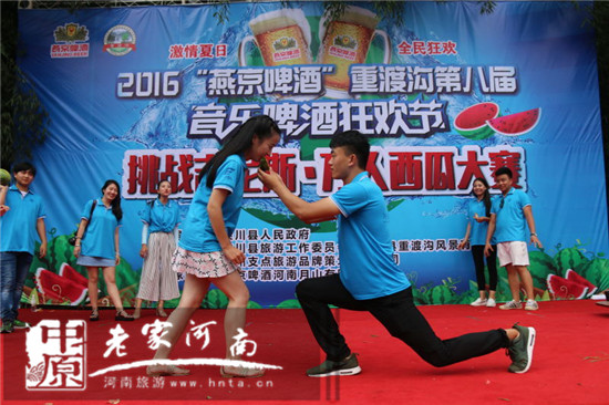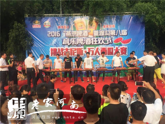 “挑戰(zhàn)吉尼斯 萬(wàn)人吃西瓜”是由欒川重渡溝風(fēng)景區(qū)和鄭州支點(diǎn)旅游品牌策劃有限公司聯(lián)合打造的2016“燕京啤酒”重渡溝第八屆音樂(lè)啤酒狂歡節(jié)狂歡不停歇第三期主題活動(dòng)。當(dāng)日重渡溝景區(qū)熱鬧非凡,擺滿(mǎn)誘人西瓜的小方桌次第擺開(kāi),翠綠的皮、鮮紅的瓤、瓜香四溢。游客們熱情參與,現(xiàn)場(chǎng)妙趣橫生。有“推土機(jī)”式掃蕩吃法,有“生猛”地大口吞咽,有小朋友萌態(tài)啃瓜表情十足......真是吃得爽快,玩得暢快,贏得痛快。比賽分為“狼吞虎咽”男子組、“大快朵頤”女子組,每組冠軍將獲得3000元現(xiàn)金大獎(jiǎng)。經(jīng)過(guò)淘汰賽、決賽層層激烈角逐,最終比賽決出男女子組一、二、三等獎(jiǎng)各一名,所有參賽選手都乘興而來(lái),滿(mǎn)載而歸!“來(lái)重渡溝吃西瓜感覺(jué)特別甜,特別痛快!從來(lái)沒(méi)有跟這么多人一起吃西瓜,一口氣連吃三塊還不過(guò)癮!”一位游客笑著對(duì)記者說(shuō)。