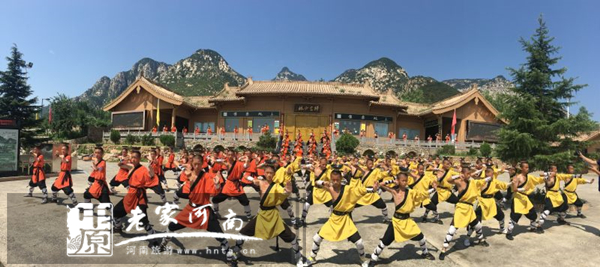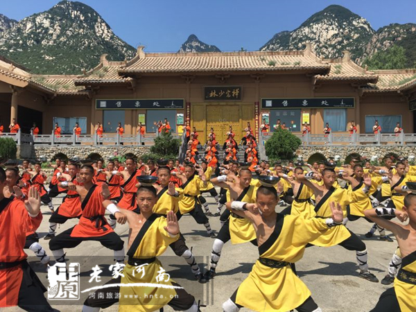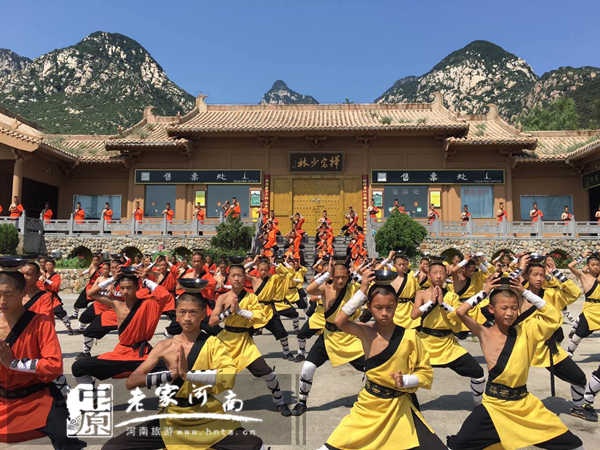 少林小子們?cè)诙U宗少林門前頂碗練功