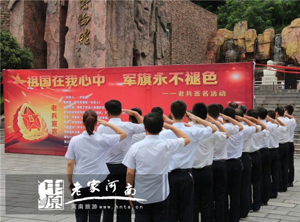 8月1日上午,在龍?zhí)洞髰{谷景區(qū)地質(zhì)博物館前,兩景區(qū)30名退伍老兵在景區(qū)總經(jīng)理趙興龍和執(zhí)行董事陳玲玲帶領(lǐng)下,站在莊嚴(yán)的軍旗前,舉行宣誓活動,活動在雄壯的國歌聲中拉開序幕,宣誓完畢后,大家在設(shè)計(jì)成軍旗式樣的簽名墻上簽名,顯示出“若有戰(zhàn),召必回”的堅(jiān)強(qiáng)決心,該簽名墻在景區(qū)保留三天,所有來景區(qū)免費(fèi)旅游的退伍老兵皆可在上面簽名。