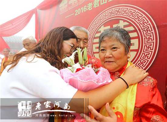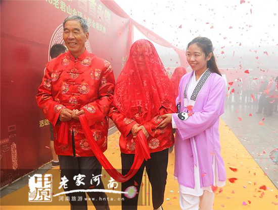 “我能想到最浪漫的事,就是一起陪你慢慢變老.....”8月7日,由老君山景區(qū)主辦的“金玉良言 白首相伴 2016老君山金頂金婚慶典”在老君山金頂?shù)烙^群道德府大院舉行!七對金婚夫婦身著唐裝,手持鮮花,行中式婚禮,以此方式重溫自己的幸福愛情!