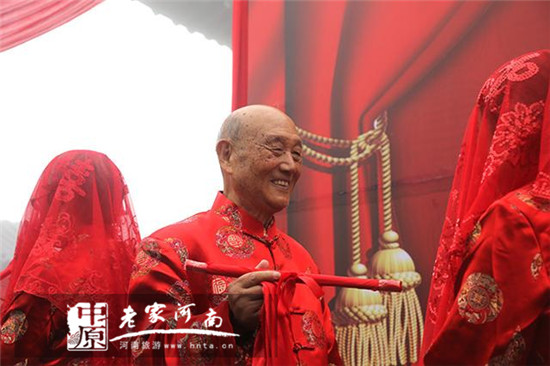 “一挑吉祥富貴,二挑幸福安康,三挑金玉滿堂”。“在挑開蓋頭的瞬間,我的眼前仿佛出現(xiàn)了50年前的那個她,雙瞳剪水,嬌羞怡人。50年走來,我們從年輕的小伙子,小姑娘變成了老頭、老太太。時間融化了我們彼此,見證了我們的愛情......”活動現(xiàn)場,一位老人深情的講到。