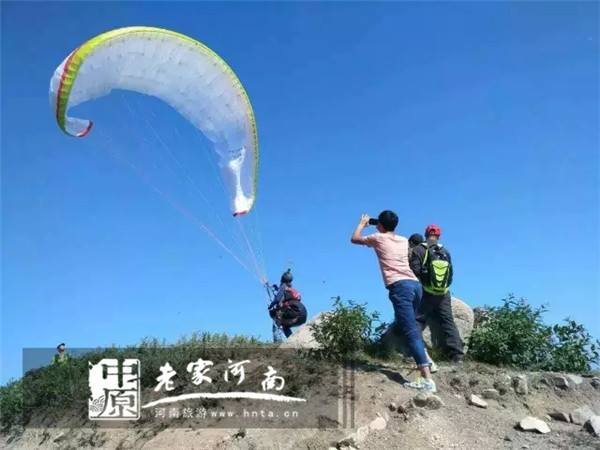9月8日,中國第一“飛人”、無動力滑翔傘飛行距離保持者宋俊明先生來到南召縣五朵山景區(qū)。宋俊明先生實(shí)地考察了五朵山景區(qū)美麗的自然風(fēng)光,對五朵山坐擁南陽盆地的優(yōu)越地理?xiàng)l件贊不絕口,他認(rèn)為這里完全有可能建設(shè)成一流的滑翔傘飛行基地。宋俊明先生還在五朵山選定了起飛點(diǎn)和降落點(diǎn),于當(dāng)天下午3點(diǎn)至3點(diǎn)半完成了他在五朵山景區(qū)的首飛。