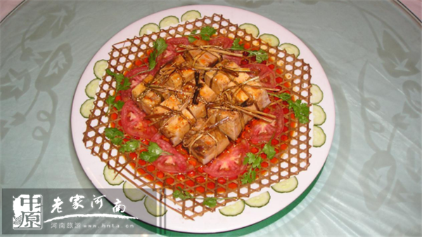 這是八里溝山民過去春節(jié)的菜肴,用豬肉做成,切成方塊,放上調(diào)料、鹽,捆上野草,蒸制而成。食用時用筷子挑開野草,做工考究,色香味俱佳,獨具地方特色。