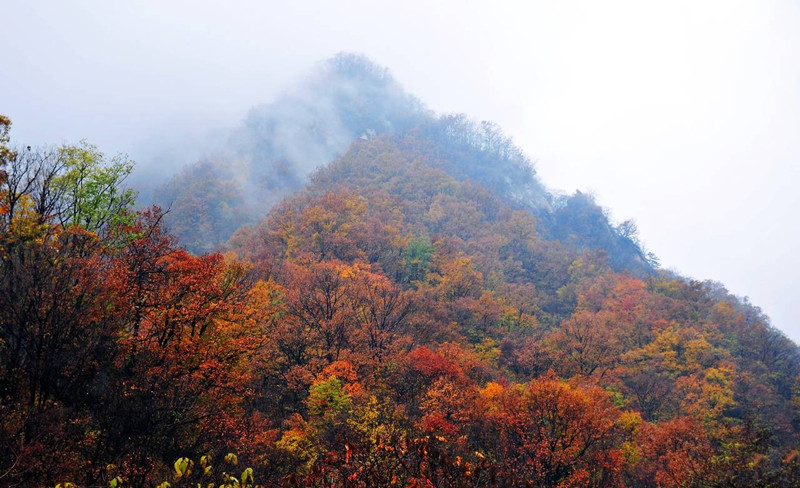 堯山紅葉與其他地方的紅葉相比有三大特點(diǎn):一是種類(lèi)多、色彩艷。主要色調(diào)以“紅、橙、黃”為主,絢爛奪目,五彩繽紛。二是紅葉周期長(zhǎng),層次多。由于樹(shù)種及海拔高度的不同,呈現(xiàn)出了層次分明,錯(cuò)落有致的天然效果,周期長(zhǎng)達(dá)一個(gè)多月。三是面積大,險(xiǎn)峰多,一望無(wú)際,蔚為壯觀。堯山的色彩一天一個(gè)樣,山中的各色紅葉嫣然含笑,盛裝登場(chǎng)。色彩斑斕的黃櫨、漆樹(shù)葉、“鬼見(jiàn)愁”、青皮椴、五角楓、七角楓等,將堯山裝扮成一個(gè)絢麗的世界。