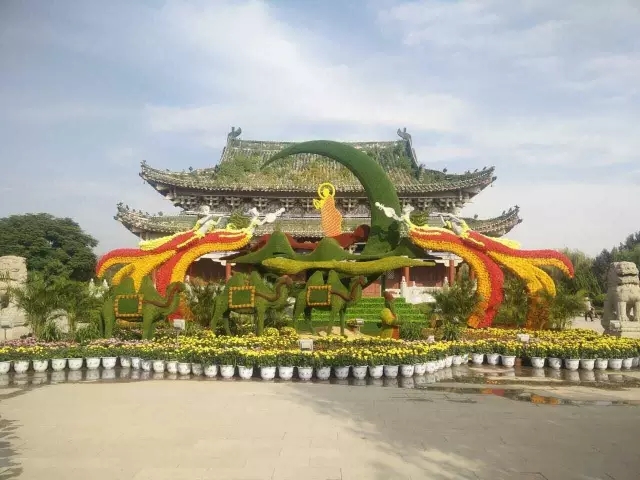 盡管離菊花文化節(jié)開幕還有一段時間,鐵塔公園內(nèi)主干道上已經(jīng)整齊地擺上菊花,一朵朵嬌艷的菊花等待盛開。大殿前的一組“仙人”或撫琴或吹笛,在彎彎的月亮兩邊飛翔,地上的“駱駝”活靈活現(xiàn),周圍數(shù)百盆菊花縈繞,顏色艷麗、造型精巧。