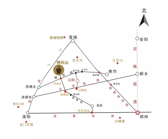太原方向:太原—太長高速(長治方向)—長晉高速(晉城方向)—晉濟(jì)高速(濟(jì)源方向)—濟(jì)源北站下高速—焦克公路—神農(nóng)山