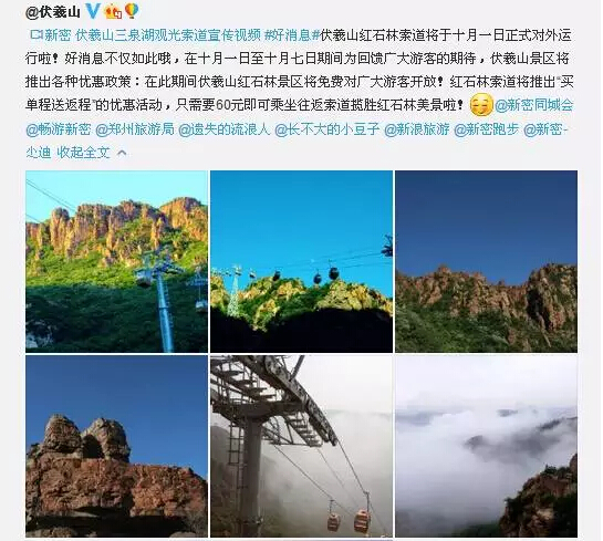 新密歷史上第一條索道開通在即!今后又有好去處啦!據(jù)伏羲山官方微博透露:紅石林索道將于10月1日正式對(duì)外運(yùn)行!好消息不僅如此,在10月1日至10月7日期間為回饋廣大游客,伏羲山景區(qū)將推出各種優(yōu)惠政策:在此期間伏羲山紅石林景區(qū)將免費(fèi)對(duì)廣大游客開放!紅石林索道將推出“買單程送返程”的優(yōu)惠活動(dòng),只需要60元(相當(dāng)于單程30元)即可乘坐往返索道攬勝紅石林美景啦!