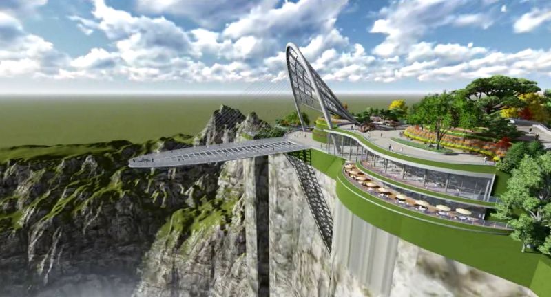 “太行珍珠”項(xiàng)目位于新鄉(xiāng)南太行關(guān)山園區(qū)東壩頭。該項(xiàng)目在1500米的懸崖上懸挑70米建設(shè)世界第一長(zhǎng)懸挑拉索的景區(qū)觀景廊橋。廊橋最寬處23.4米,懸挑最遠(yuǎn)處可達(dá)70米。