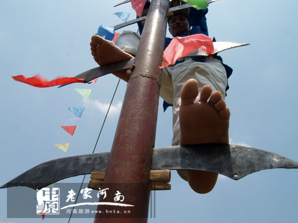 “ 上刀山 ” 也稱 “ 上刀梯 ” ,刀梯由一根高1 2米 的鐵柱,72把鋒利無比的鋼刀和頂端上邊3把寒光逼人的鋼叉組成。