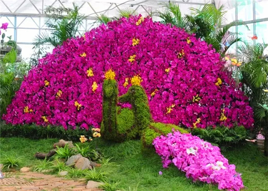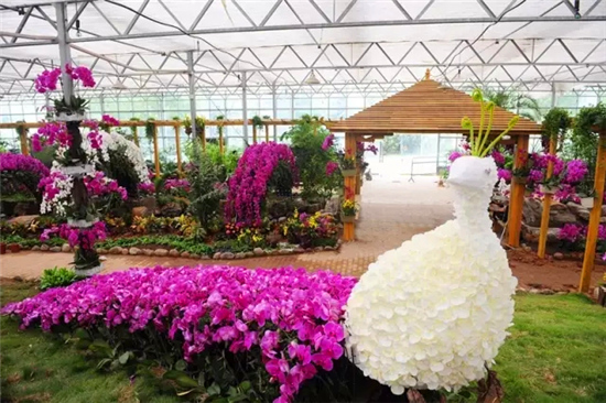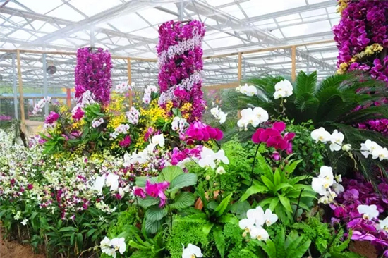 細(xì)細(xì)長長的花梗勾勒出優(yōu)美的弧度,花梗盡頭開出白色、紅色、紫色的花朵,好像振翅欲飛的蝴蝶在風(fēng)中舞動,這就是“洋蘭王后”蝴蝶蘭。本次蝴蝶蘭展以原生態(tài)為主題,利用枯藤樹枝、精品花卉、綠草、竹排等自然產(chǎn)物為主元素,為大家呈現(xiàn)“彩云逐月”、“飛流照影”、“幽谷聽蘭”、“馨巢蘭韻”、“童話森林”、“綠色家居”等十大主題場景。在4000平方米的溫室內(nèi)百余種、6萬株蝴蝶蘭將迎頭怒放,玫紅、紫紅、鮮黃、粉白花朵掛滿枝頭,形成色彩艷麗、百花盛開、萬紫千紅的美麗景象。