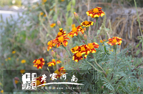 這一簇簇山花叫“山菊花”,開在每年的9月底,專為國慶節(jié)而開。她們開在九蓮山山門外的小村莊“松樹坪”。非人工種植,天然生成。