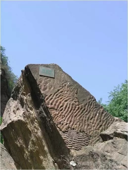 3、大家伸出手指看一下我們的指紋,然后我們?cè)倏匆幌逻@塊石頭上的紋理,兩者相比紋理造型很相似,但我們的指紋非常細(xì)小,石頭上的紋理卻很粗大,恐怕只有巨人才能留下這么大的指紋,所以稱這塊石頭為“巨人指紋”。這里的波紋屬于一處典型的平涉波痕,巖石表面的沉積物在水或風(fēng)的作用下,發(fā)生遷移,留下遺跡附著在層面上,形狀極似水的波痕。在龍?zhí)洞髰{谷長(zhǎng)達(dá)3㎞的紅石峽谷內(nèi),分布了大量的崩塌巨石,在這些巨石的層面上,可以看到上面有各種不同類型的波痕,是國內(nèi)罕見的“天然波痕博物館”。