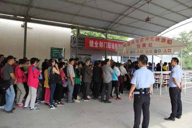 如此龐大的旅游團(tuán)集中到達(dá),并沒有讓景區(qū)接待部門手忙腳亂。游輪檢票口打開備用通道,增加臨時(shí)檢票人員和外勤人員,有條不紊地組織引導(dǎo)游客買票、排隊(duì)、登船、拍照,充分體現(xiàn)了濟(jì)源黃河三峽景區(qū)良好的接待能力和工作素質(zhì)。 整個(gè)場(chǎng)面井然有序。