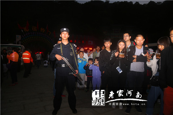 4日,天氣轉(zhuǎn)涼,秋風(fēng)瑟瑟。下午6點30分,景區(qū)驗票系統(tǒng)顯示還有3800余名游客沒有下山,預(yù)計游客全部下山還得3個小時。陣陣秋風(fēng)寒氣逼人,一天的游玩、漫長的等待讓人腿乏腳困、又饑又渴。危難之時,欒川縣旅游警察聯(lián)合老君山景區(qū)出手相助,為游客送上了熱騰騰的“暖身湯”,并持槍執(zhí)勤護(hù)衛(wèi)周全。