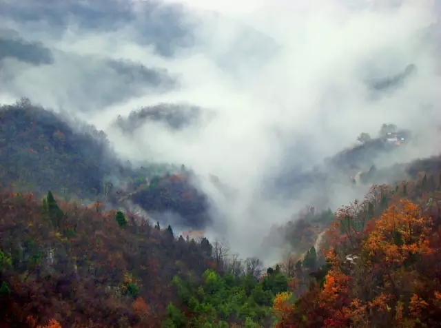 槐香零落,桂花飄香,一季秋的清涼。淺秋的風,很輕,也很柔,攜著一瓣花或一枚葉在風中輕盈舞動,委婉旋轉(zhuǎn)。秋天的云臺山是豐富多彩的。漫山遍野的蒼松翠柏郁郁蔥蔥,黃櫨和紅楓交錯其間,層林盡染,五彩斑斕,似飛紅流翠,如詩如畫,讓人心醉,讓人神迷。