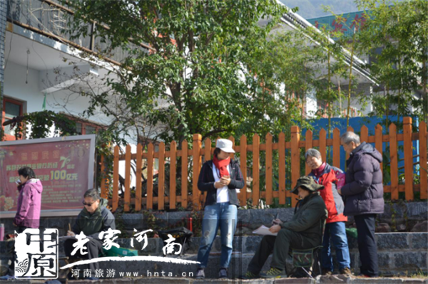 10月30日8時(shí),八里溝拆除山門外全部私搭亂建鐵皮商攤后,迎來一批來自西安的畫家。他們?cè)谠瓉泶箨?duì)部新建的木欄桿臺(tái)上支起畫板,將山門建筑和遠(yuǎn)方山脈納入畫中。