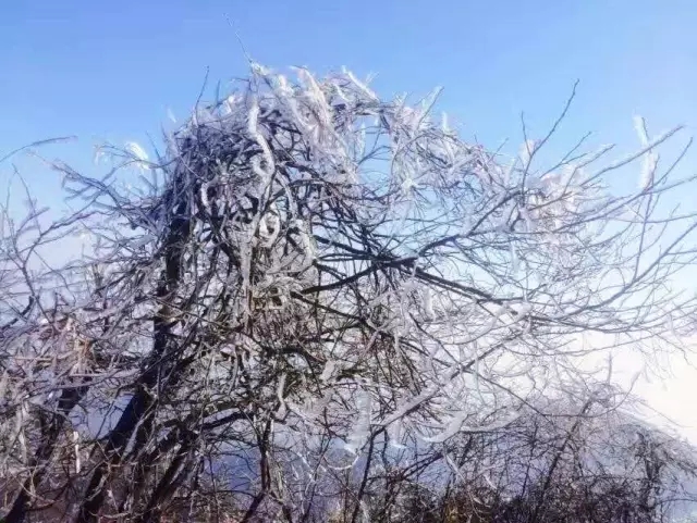 老樂山云頂樹茂枝繁,冬日里騰起來的水霧,遇到寒冷的空氣凝結成了霜花。