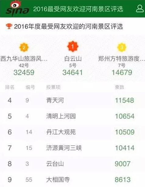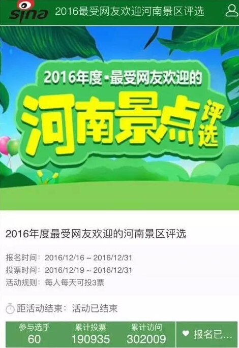 經(jīng)過網(wǎng)友熱烈的參與投票,由新浪河南旅游頻道主辦的“2016最受網(wǎng)友歡迎的河南景區(qū)”評選活動成功落幕。本次活動從報名到評選結(jié)束一共持續(xù)了15天,通過網(wǎng)友推薦以及景區(qū)自薦共有60家河南景區(qū)參與,累計投票190935票 ,頁面訪問量達302006次。