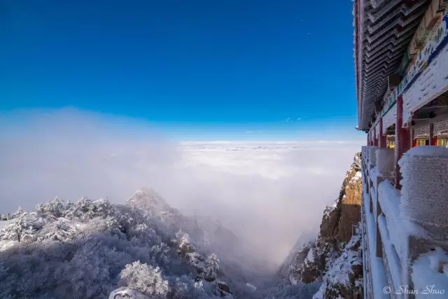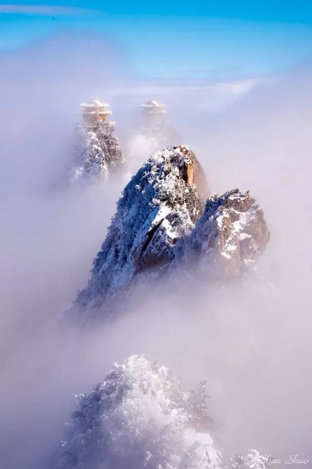 雪后的老君山,白雪皚皚、銀裝素裹,加之云海浮現(xiàn)與藍天白云交相輝映,絕壁道觀似瓊樓玉宇幻如仙境美不勝收。