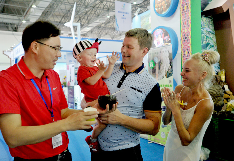 來(lái)自俄羅斯的一家人在國(guó)際旅游島展區(qū)品嘗海南椰子食品