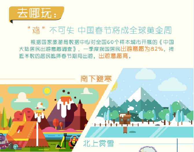 根據(jù)國(guó)家旅游局?jǐn)?shù)據(jù)中心對(duì)全國(guó)60個(gè)樣本城市開展的《中國(guó)大陸居民出游意愿調(diào)查》,一季度我國(guó)居民出游意愿為82%,接近半數(shù)的居民選擇春節(jié)期間出游,出游意愿高。