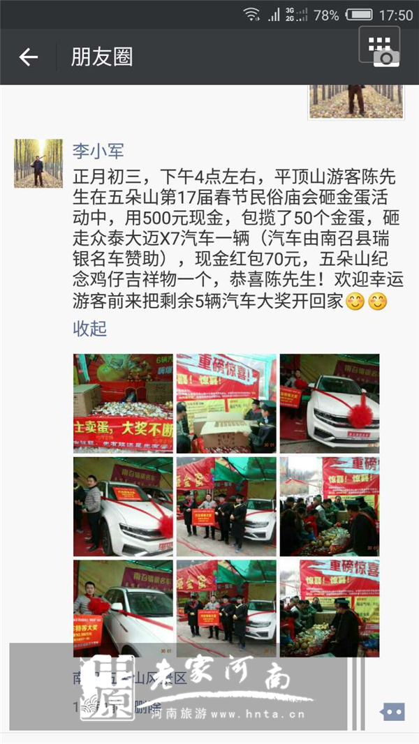 初三下午的活動(dòng)現(xiàn)場,終于有人砸出了汽車大獎(jiǎng)。來自平頂山的李先生,用500元一口氣包攬了50枚金蛋,開走了一輛眾泰大邁X7。出門旅個(gè)游,返程多輛車這好運(yùn)氣讓周圍的游客羨慕不已。