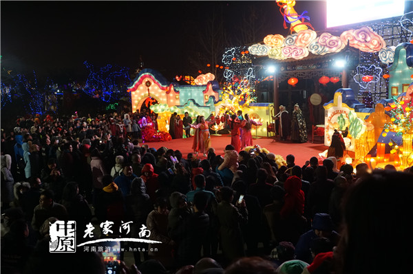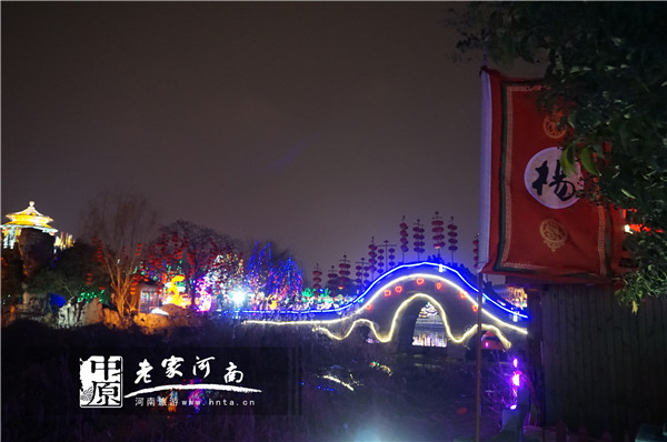 其中,設(shè)置在景區(qū)北大門外的《瑞鳳賀春》燈組氣勢(shì)宏大。這里,6根華麗的“牡丹花柱”高高聳立,一座“彩門”凌空飛架,兩面楊家將“帥旗”迎風(fēng)招展,巨大的“雄雞”兀立在“彩門”之上展開七彩羽翼,并“浴火重生”嬗變?yōu)?ldquo;火鳳”,從而形成一種巨大的視覺張力,也傳遞出人們對(duì)生活的美好祝愿。而設(shè)置在“楊府家宅”西花園的《富貴吉祥》和《天鵝湖》燈組則另有一種韻味。這里,一朵碩大的“紅牡丹”吐露芳菲,綻放在碧波潭中;兩只姿態(tài)優(yōu)雅的“天鵝”曲頸長(zhǎng)吟,帶領(lǐng)著一群“小天鵝”在水面嬉戲;周邊山石嶙峋、彩蝶紛飛,無數(shù)“吉祥果”在樹叢中輕輕搖弋,從而使一幅有滋有味的“庭院美景”驀然展現(xiàn)在人們面前,讓眾多游客流連忘返。