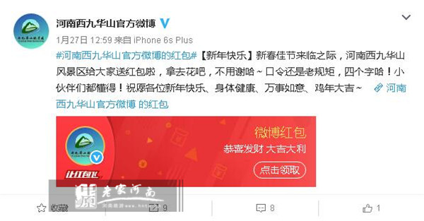 春節(jié)期景間,信陽西九華山景區(qū)特推出龍津溪地半價游活動,凡在景區(qū)購買任一景點門票或景區(qū)通票的游客,憑所持票根即可享受半價游玩龍津溪地的優(yōu)惠政策。同時,景區(qū)通過新浪微博,為廣大網(wǎng)友發(fā)送10000元新年紅包!登錄新浪微博,輸入口令“西九華山”即可領取紅包。