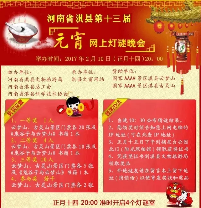 想免費游覽淇縣云夢山、古靈山嗎?2月10日(正月十四)20:00,淇縣第十三屆網(wǎng)上元宵節(jié)燈謎晚會將隆重舉辦。屆時,您只要登錄淇縣旅游網(wǎng)(