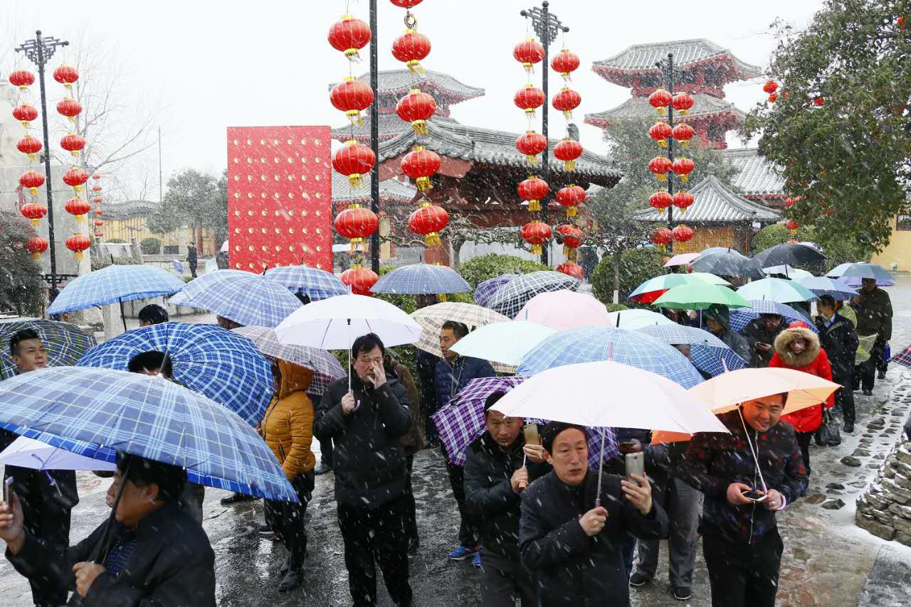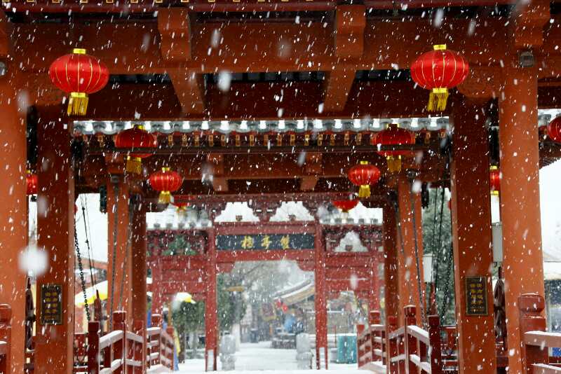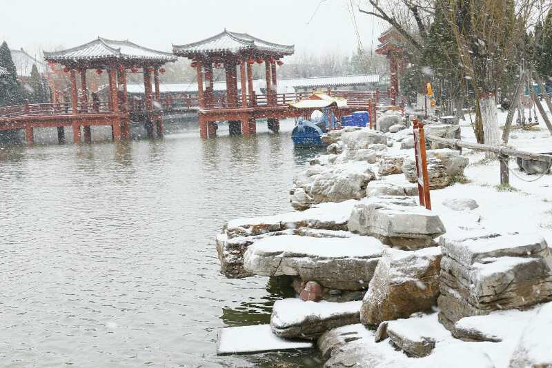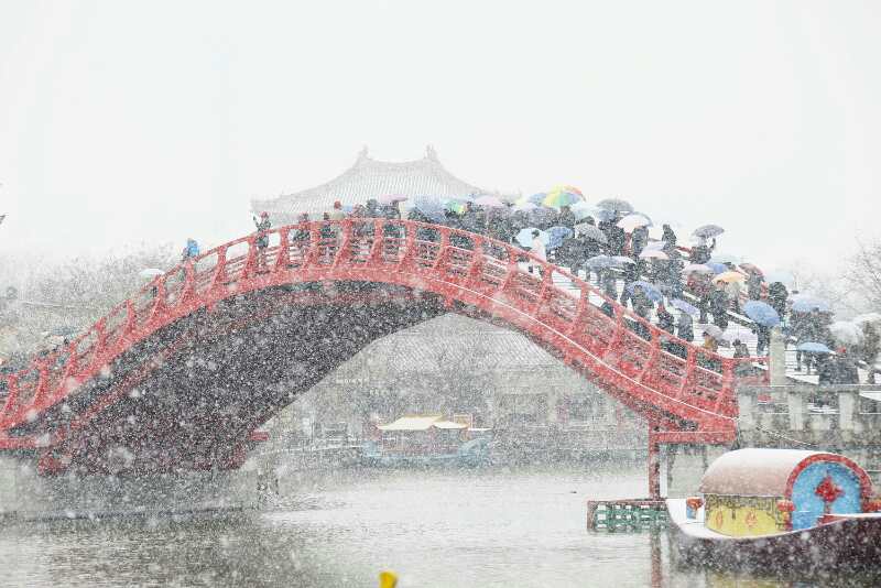 前兩天氣溫升高,恍若春至,伴隨著昨日的大風(fēng),今日大雪如期而至,瞬間把清明上河園裝點(diǎn)成了冰雪童話世界。