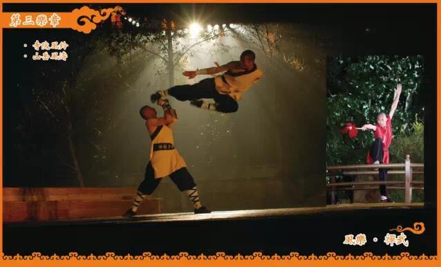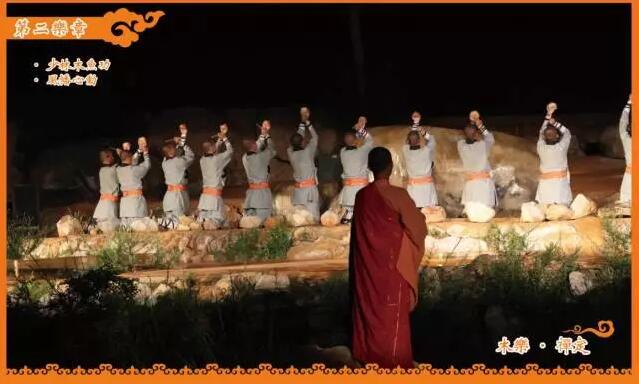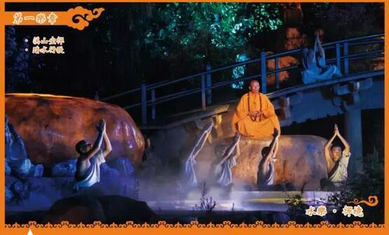 《禪宗少林•音樂(lè)大典》實(shí)景演出由《水樂(lè)·禪境》、《木樂(lè)·禪定》、《風(fēng)樂(lè)·禪武》、《光樂(lè)·禪悟》、《石樂(lè)·禪頌》五個(gè)樂(lè)章組成。