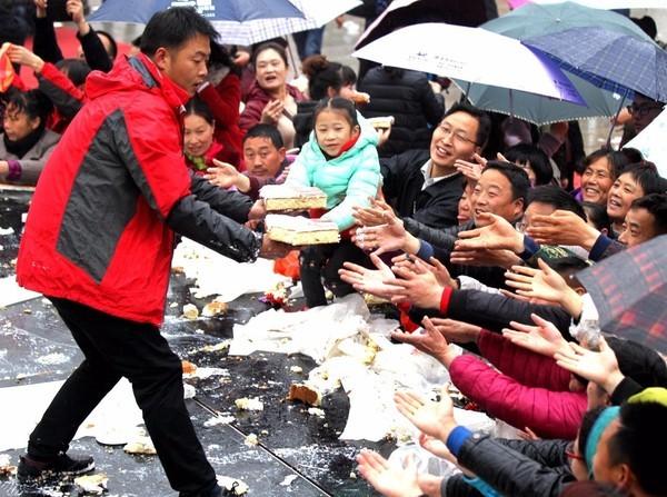 3月12日,農(nóng)歷丁酉雞年二月十五。道教圣地——河南老君山紀念老子誕辰2588周年活動現(xiàn)場,工作人員正將經(jīng)過高功法師加持“;”能量的蛋糕免費發(fā)放給游客。