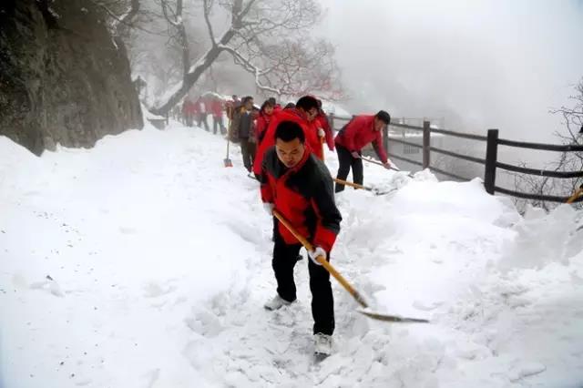 由于連續(xù)的春雪,老君山的道路也被厚厚積雪覆蓋,為了給游客一個安全的游覽環(huán)境,也為了能讓游客領略到最美的老君山風光,老君山人上下集體出動,參加義務除雪勞動。大雪后的老君山雖美,但更因這一群老君山人而讓大家能夠領略到美景。
