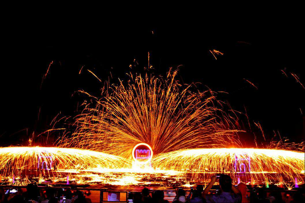 華夏歡歌,普天同慶;蒼龍一笑震山河,譜寫盛世華章。長城鐵花的這種打法速度極快,傾撒面積極其壯闊。只見鐵水騰空處,處處紅光一片,壯觀震撼中,山河呼嘯,似華夏萬眾普天高歌,激情歌舞。