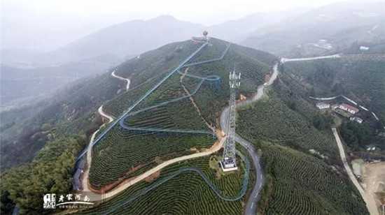 新建成的茶山觀光滑道,根據(jù)茶山陡峭、奇險(xiǎn)的地勢(shì)特點(diǎn)設(shè)計(jì),全長(zhǎng)1200多米,整體落差達(dá)158米,勢(shì)如盤龍,依山就勢(shì)甚為壯觀。乘坐觀光滑道直達(dá)茶山之頂,舉目四望,山前梯田如鏡,村舍如在畫中。四周峰海山濤、云水煙雨的山水美景如同一幅幅水墨畫展現(xiàn)在眼前。下山時(shí)乘坐滑道盤旋而下,茶園竹海如綠波盡入眼底,可享受穿梭于茶山竹林之中、貼地飛行的快感。
