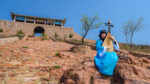 走過畫天門,偶遇一彈琵琶女子,引得大家爭相與其合影。(攝影:任紅兵)