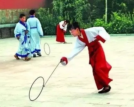 用鐵鉤推動(dòng)鐵環(huán)向前滾動(dòng),以鐵鉤控制其方向,可以直走拐彎,速度可快可慢,可以鍛煉人的協(xié)調(diào)能力和平衡能力。