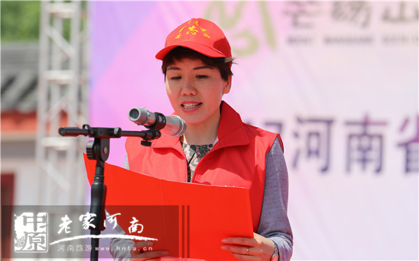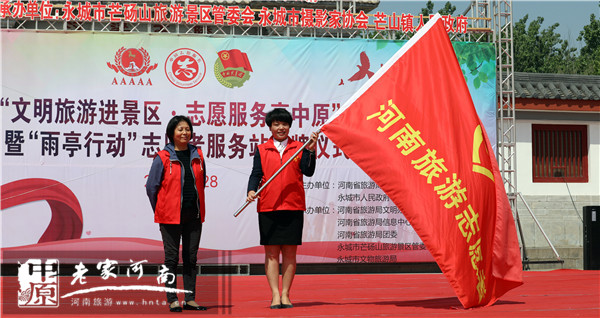 河南省旅游局辦公室調(diào)研員張九菊向青年志愿者服務(wù)隊(duì)授旗