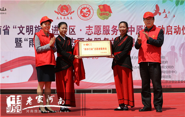 河南省旅游局信息中心副主任謝堅(jiān)、芒碭山旅游開(kāi)發(fā)總公司總經(jīng)理魯玉 共同為“雨亭行動(dòng)”志愿者服務(wù)站揭牌
