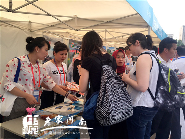 旅發(fā)委工作人員為國(guó)際友人現(xiàn)場(chǎng)介紹濟(jì)源旅游景區(qū)