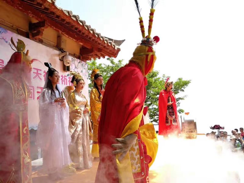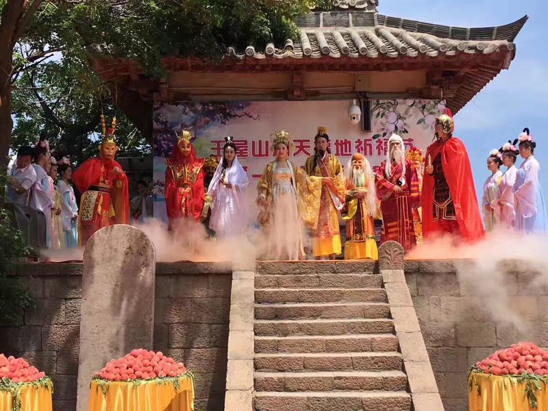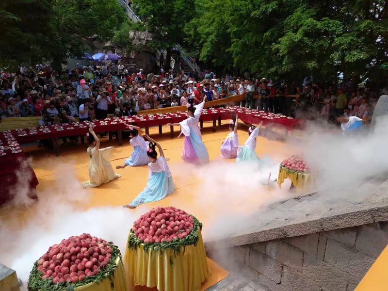5月20日,濟(jì)源王屋山景區(qū)首屆“洞天福地祈福節(jié)”開幕,在海拔1715米的天壇極頂大擺“蟠桃宴”,玉帝、王母攜眾仙到場主持,吸引了數(shù)千游客參加,供游客品嘗的近萬斤仙桃被吃光。
