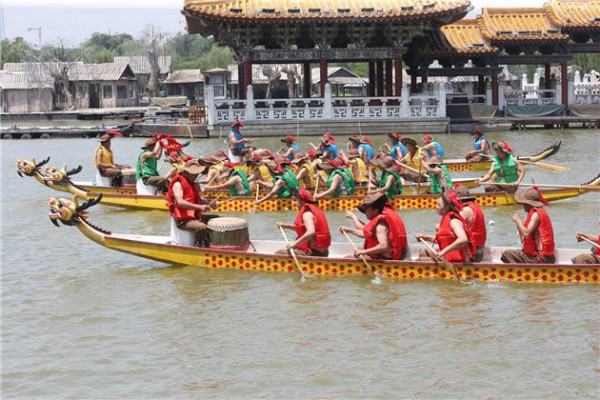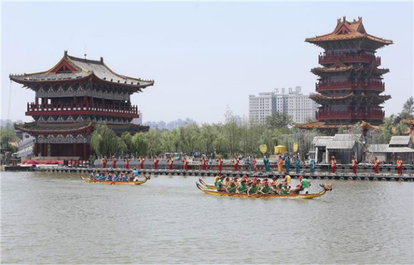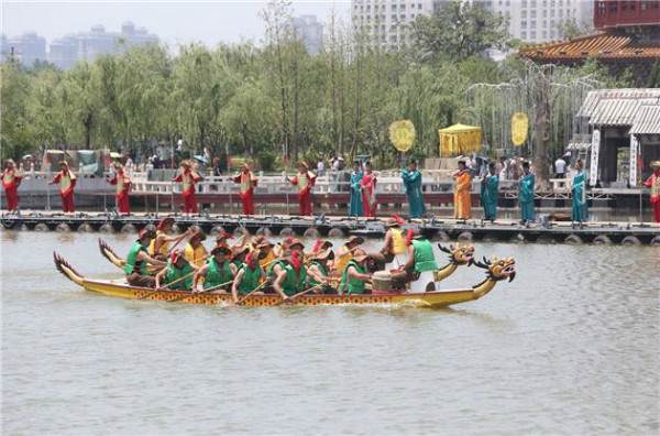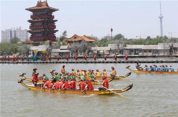 5月28日,清明上河園內(nèi)表演的龍舟比賽精彩紛呈,吸引許多游客觀(guān)看。