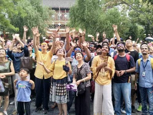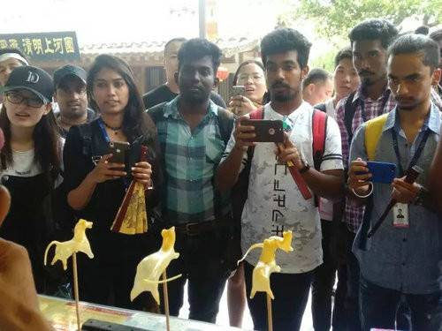 被清園藝人征服的印度美女帥哥,紛紛合影留念。他們很開(kāi)心,清明上河園之旅不虛此行!
