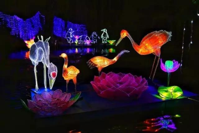 天波碧潭里荷花荷葉燈閃耀、魚燈鶴燈錦簇。夜風(fēng)拂面的湖面,清波蕩漾,湖中燈色交映。