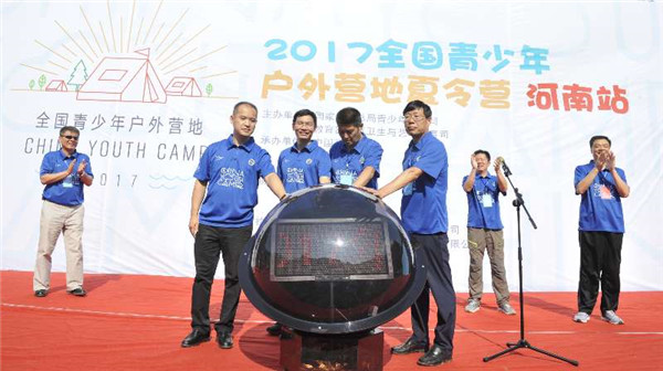 中國登山協(xié)會青少年委員會秘書長曹榮武、河南省體育局副局長王鵬、河南省教育廳巡視員李金川、河南省體育局青少處副處長彭剛、河南省教育廳體衛(wèi)藝處副調(diào)研員高翔、登封市副市長史戰(zhàn)勝、全國青少年戶外活動營地嵩山營地(嵩山傳奇)董事長朱全奇等領(lǐng)導(dǎo)出席活動并共同按下啟動球宣布“2017全國青少年戶外營地夏令營(河南站)”夏令營正式開始。