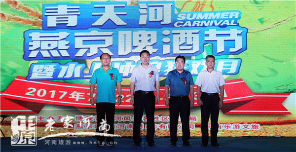博愛縣委副書記張紅衛(wèi),縣委常委、組織部部長(zhǎng)張忠偉,景區(qū)管理局局長(zhǎng)龐國(guó)平,燕京啤酒(河南月山)有限公司常務(wù)副總經(jīng)理金華東登臺(tái)共同按下大屏幕上象征“水上沖浪狂歡”的水滴,為2017青天河燕京啤酒節(jié)暨水上沖浪狂歡月拉開序幕。